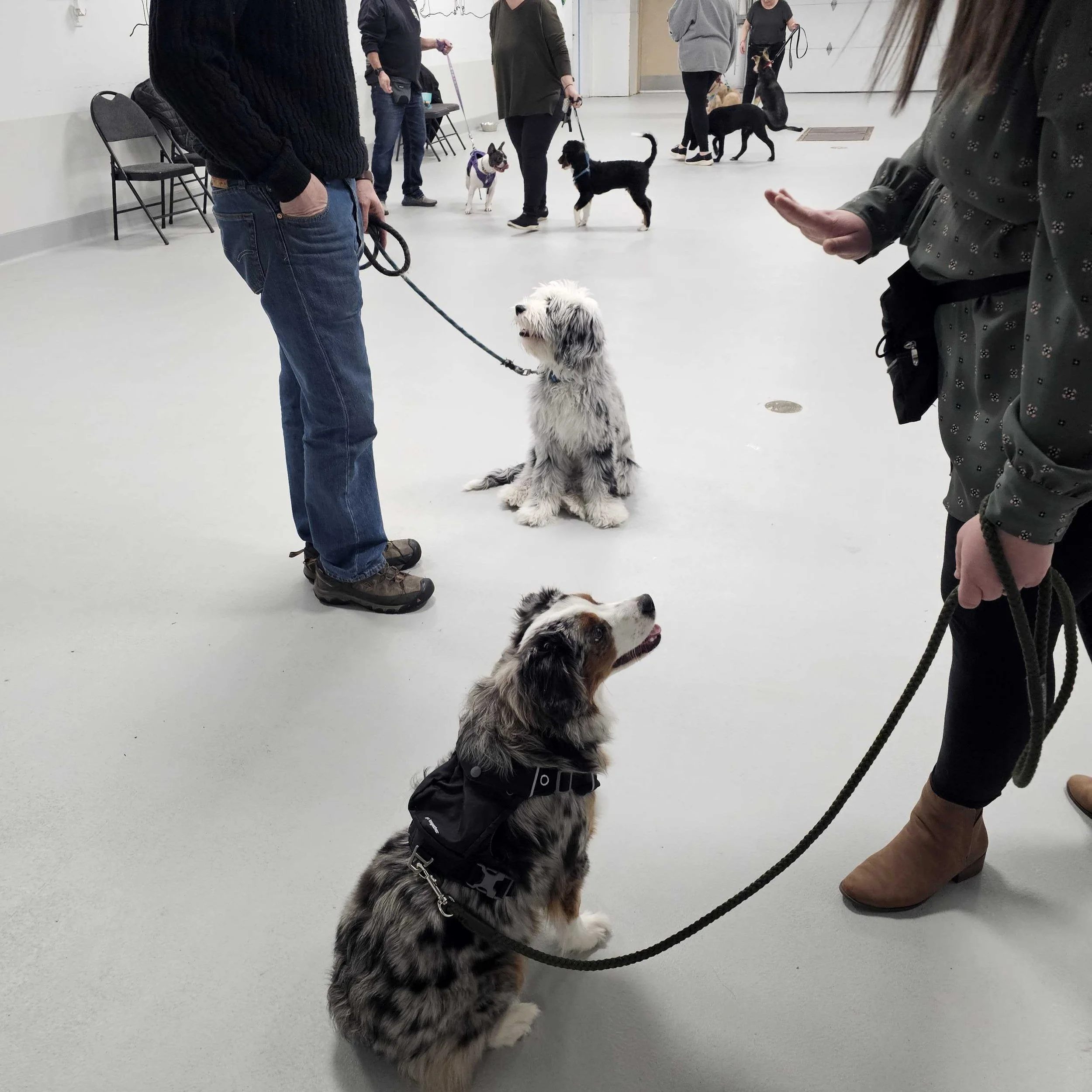 A: We focus on leash manners, listening around distractions, sit, spin, sit-stays, and more — all in a supportive group environment. What makes this class unique is the combination of on-leash training and off-leash group playtime.